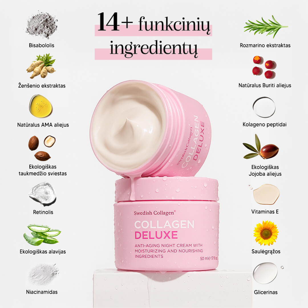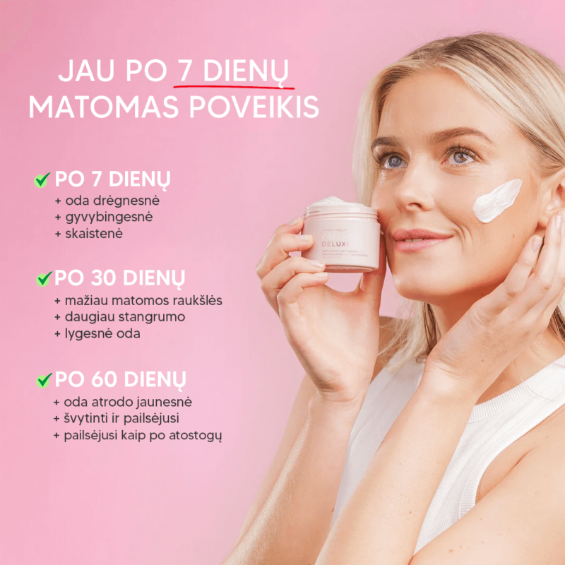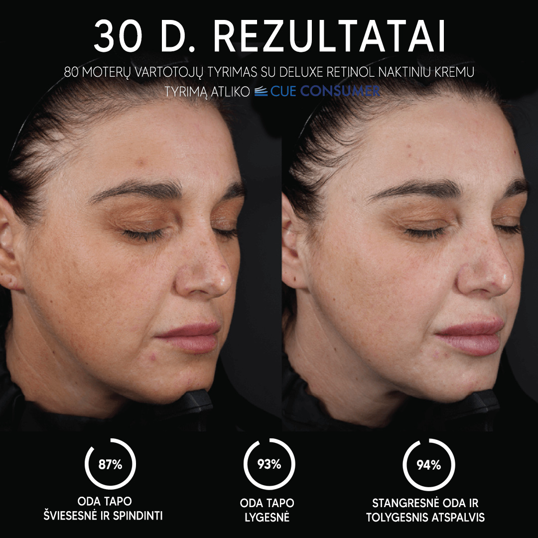 Sąžiningai – rinkoje pilna kremų, kurie gražiai atrodo, bet realiai neduoda jokio rezultato. Su Deluxe Retinol naktiniu kremu yra kitaip – jis dirba giliau. Retinolis + kolageno peptidai stimuliuoja odą gaminti daugiau kolageno. Rezultatas – vizualiai lygesnė, stangresnė oda.