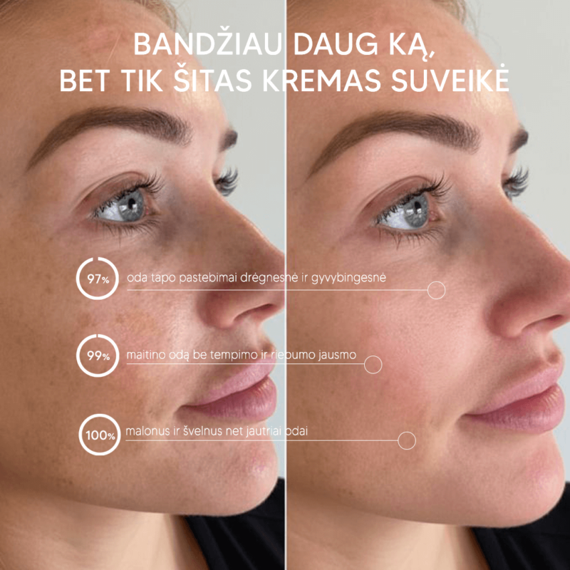 Skirtumas tas, kad čia ne tik drėkinimas, o tikras anti-age mechanizmas. Daug kremų tiesiog padengia odą silikonais, o čia naudojamos veikliosios medžiagos: retinolis, niacinamidas, vitaminas E, alavijas, taukmedžio sviestas. Rezultatas – mažiau raukšlių, daugiau stangrumo, skaistesnė spalva.