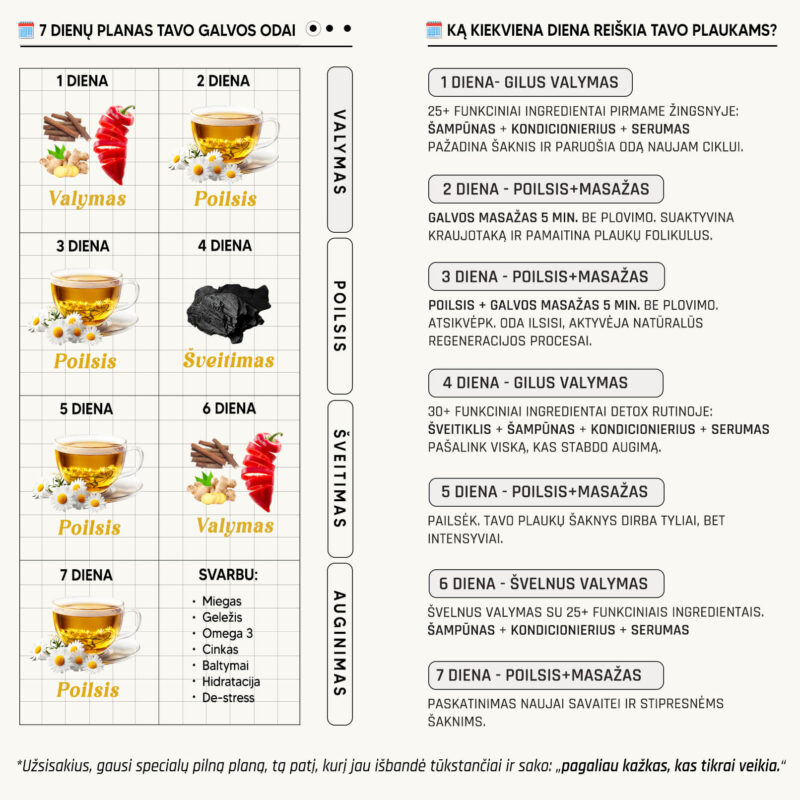 Kitas dalykas, kuris nustebino yra šešių dienų sudarytas planas, laikiausi ir kiekvieną dieną Tavo šampūnas internetinėje asmeninėje paskyroje rytais sulaukdavo labai malonių žinučių, kurios buvo ne tik informatyvios bet ir pakeldavo nuotaiką :) Jau po pirmo plovimo pastebėjau, kad plaukai mažiau riebaluojasi, kas man yra labai aktualu, kadangi mano plaukai yra ploni ir sausi tačiau galvos oda gan greitai susiriebaluoja. Taip pat labai patiko kondicionierius, jis gaiviai kvepia ir tikrai minkština plauką. Dar vienas dalykas kuris man labai svarbus, tai kad Jūs nemeluojate jog šampūnas su kondicionieriumi sutvarkys visas problemas, tam svarbi tinkama mityba ir sveika gyvensena.