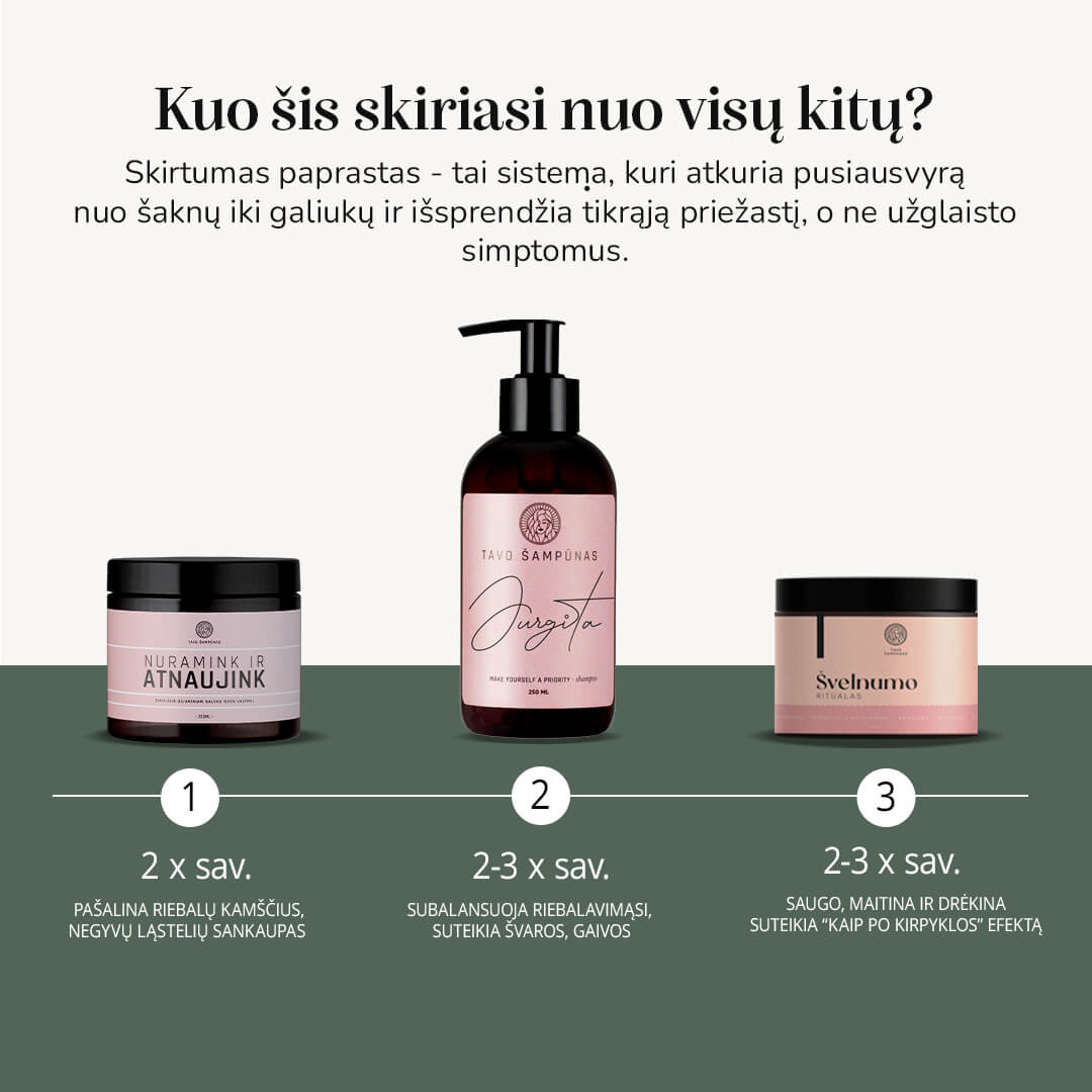 Esu išbandžiusi daug priemonių,bet vis kažkas netiko, niekada antrą kartą neužsisakydavau. Stebėjau " Tavo šampūnas" reklamą ilgą laiką, nesusilaikiau ir užsisakiau pirmi trys plovimai nepatiko, bet turėjau galimybę pabendrauti su atstove, ji pateikė kelis pasiūlymus,kaip naudoti, kaip ir ką geriau daryti,ir jos rekomendacijos dėka, daviau antrą šansą šampūnui įtikti mano plaukams po kelių plovimų plaukai suminkštėjo,atsirado žvilgesys, nesivelia... tikras "kosmosas" mano plaukams.Praėjus mėn laiko, plaukų būsena pasikeitė. Vėliau užsisakiau serumą, čia antras atradimas, geras kvapas,neapsunkina plauko .. dabar serumas, šveitiklis ir šampūnas nr 1, keisti nenoriu ir rekomenduoju visiems. P.S užsakymą dariau antrą kartą