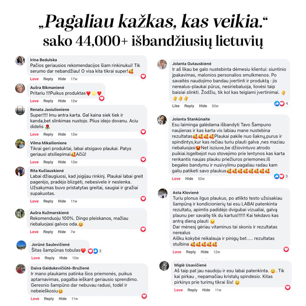 Nors jau senai seku Jus facebook’e, tačiau vis abejojau, ar pirkti Jūsų produkciją, ar ne, nes galvojau, jog čia eilinis šampūnas, kuris tikrai negali padėti mano riebiems ir besiveliantiems plaukams. Paklausta vaikino, ko norėčiau gauti dovanų, iš kart į galvą kilo mintis, jog Jūsų šampūnas ir kondicionierius yra būtent tai, ko noriu. Jau po pirmo plovimo plaukai pasidarė švelnesni, labai kvepėjo, malonu buvo juos liesti, net draugas nustebo, kad perbraukus pirštais per plaukus, jie neįstrigo plaukuose, kaip buvo anksčiau… Ačiū Jums už galimybę pajusti tai. Tikrai rekomenduosiu draugėms ❤😍