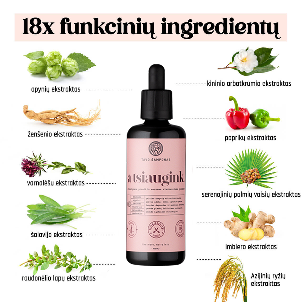 Apdovanotų mokslininkų sukurta unikali formulė su daugiau nei 10 natūralių augalų ingredientų. Mūsų serumas yra sukurtas iš ypatingų natūralių ingredientų, tokių kaip apynių, ženšenio, imbiero, šalavijo, varnalėšų, raudonėlio lapų, paprikų, kininio arbatkrūmio ekstraktų, serenojinių palmių vaisių, amino rūgščių komplekso, ir keratino. Šie ingredientai synergijos būdu veikia plaukų šaknis, skatindami sveiką augimą ir maistinių medžiagų absorbciją.